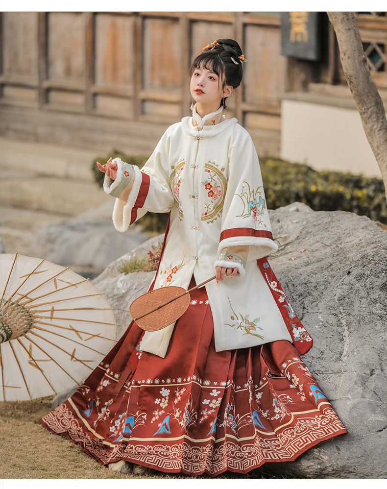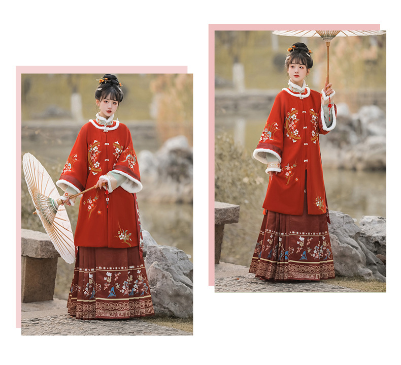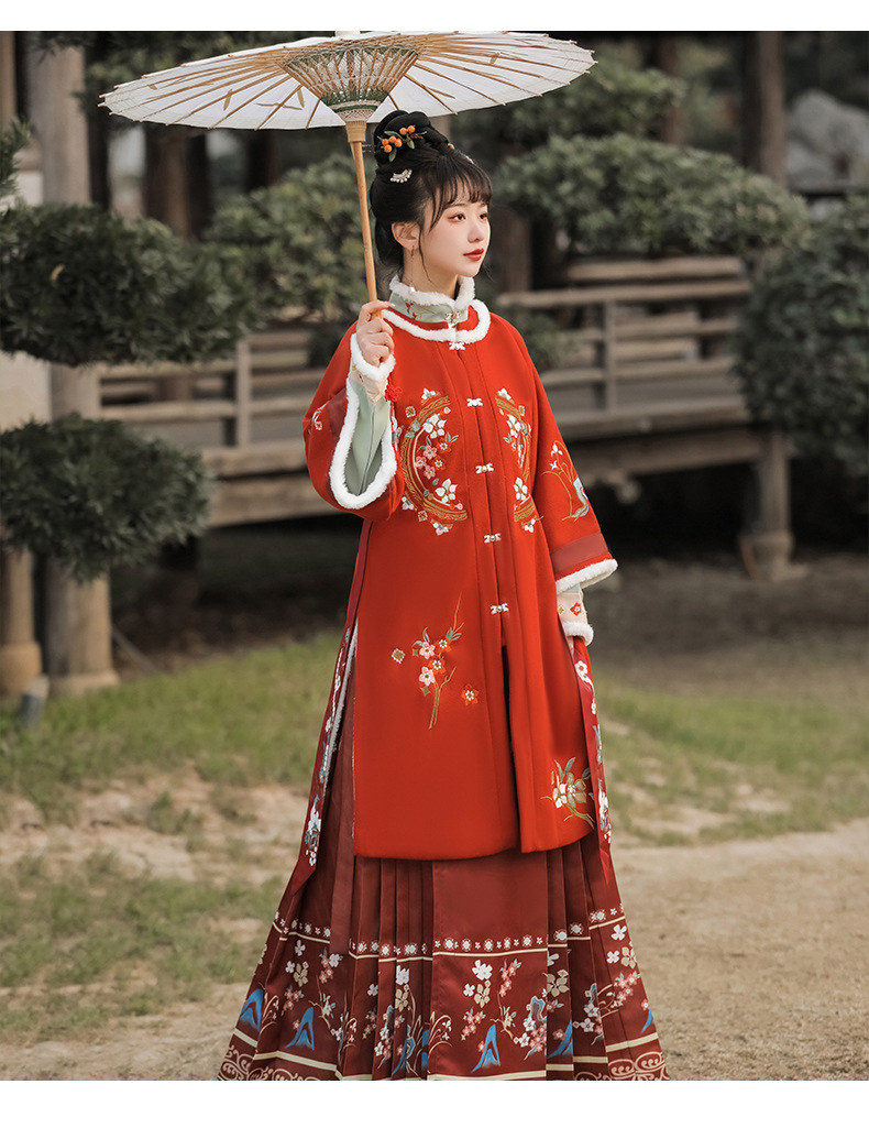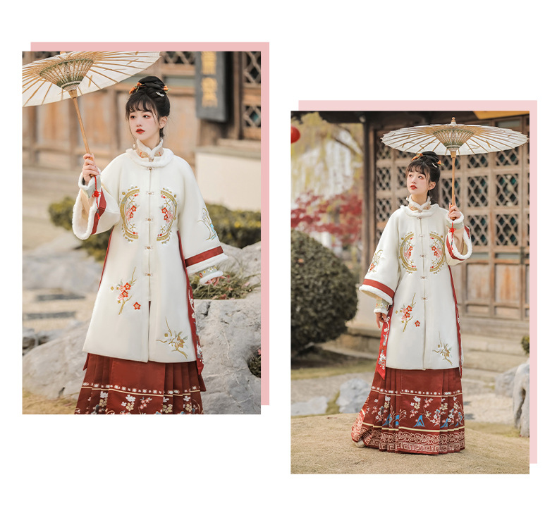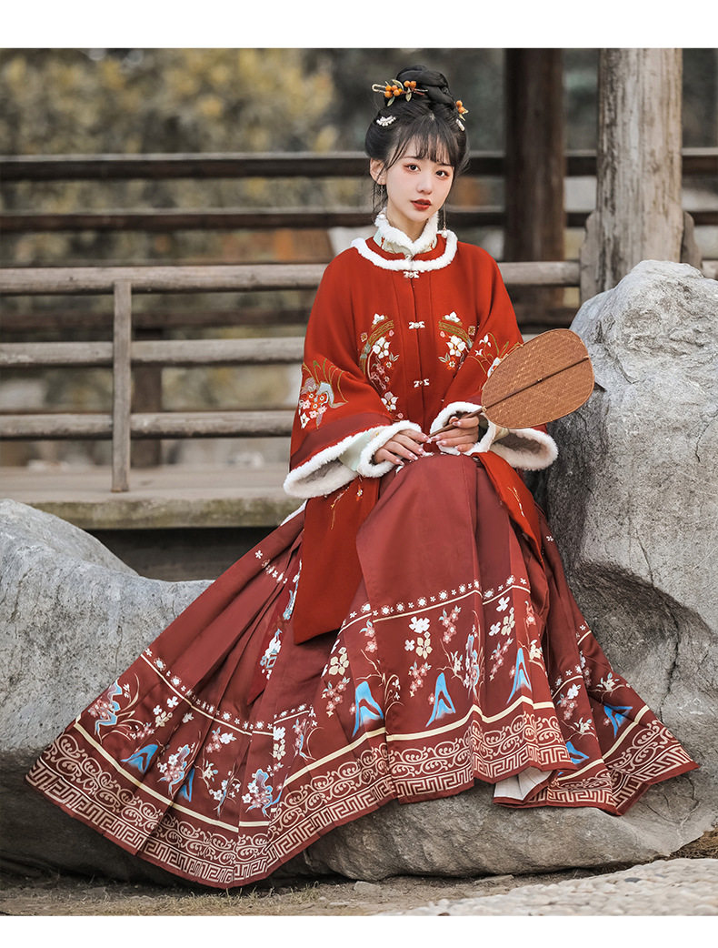 原创汉服女中国风圆领披袄秋冬季保暖立领新年战袍对襟马面裙套装