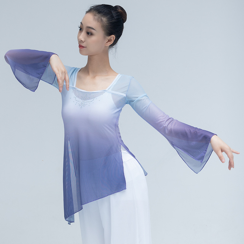 古典舞演出服新款古典舞蹈演出服装显瘦飘逸渐变纱衣练功服风上衣